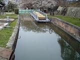 {右・寄}琵琶湖疎水 復元木造船 大神宮橋から左にはインクラインの台車に乗せられた木造船(三十石舟)が見える。琵琶湖疏水で使用されていた運輸船を平成22年に復元したもの。橋の下を流れる琵琶湖疏水は琵琶湖の湖水を京都へ通す水路で府知事・北垣国道が計画し明治16年(1883)工部大学(現:東京大学)を卒業したばかりの田邉朔郎が中心となり設計した。明治18年着工し明治23年鴨川までが完成しその後濠川、宇治川まで繋がった。明治45年(1912)には琵琶湖〜蹴上までの第2疏水も完成した。橋の右の蹴上ダムで第1と第2疏水が合流している。疏水の水は水運、灌漑、水道、発電、防火、工業など多目的に利用され疏水関連施設はインクライン、水路閣など大津から京都までの12箇所が平成8年指定国史跡となっている。 |