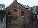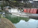{右・寄}蹴上ダム(船溜り) 旧:九条山浄水場ポンプ室 大神宮橋から右に見える。当初は疏水を往来する船を留める場所でもあり水は浄水用や発電用に使われた。現在はダム右に蹴上浄水場と山之内浄水場の共同取水場がありさらに奥には旧:九条山浄水場のポンプ室の建物がある。九条山浄水場は背後の九条山にあり明治45年(1912)完成した御所水道の取水場が元で昭和22年(1947)水道水確保の増強策で宮内庁から市に譲渡され改築後の昭和24年浄水場となった。昭和62年に老朽化のため浄水施設としては休止し現在は水質対策などの実験施設となっている。ポンプ室は貯水槽に揚水するための渦巻ポンプ3台を置く建物で青銅葺煉瓦造。皇太子時代の大正天皇が疏水を舟下りする計画があり要人が出迎える場所にする予定で疎水側にも玄関がある。 |
