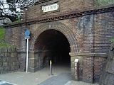 {右・寄}ねじりマンポトンネル 2番出口の向かいにある。インクラインをくぐるためのレンガ造りアーチの歩行者用トンネル。レンガが螺旋状に積まれておりねじりの構造は強度を保つレンガ積み技法の1つ。トンネル入口には「雄観奇想」出口には「陽気発処」扁額があり共に琵琶湖疎水を計画した京都府知事・北垣国道の揮毫。出口側の扁額は破損している。北垣国道は天保7年(1836)但馬国の豪農の生まれで戊辰戦争前に鳥取藩に仕官し維新後は高知県令、徳島県令、北海道庁長官、貴族員議員、枢密院顧問官を歴任した。京都市上下水道局疏水事務所(左京区聖護院蓮華蔵町35)には明治35年(1902)建立されたものの戦争供出され平成2年に再建された銅像がある。トンネルをくぐれば何有荘や南禅寺などへ通じる。 |