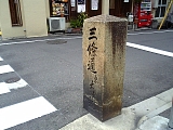 {右}「三條通 東 大津道」道標 少し進んだ交差点の角にある。建立年不明で高さ110cm。正面に「三條通」の下に「東 大津道」とあり左面に「左」の下に「動物園」「真如堂」と並び下に「黒谷 道」とある。動物園とは東京の上野動物園に続き国内2番目の動物園として明治36年(1903)開園した京都市動物園(左京区岡崎法勝寺町126)のことで右折300m左にある。市費と市民の寄付で創設され開園時の収容動物は61種238点だった。黒谷とは金戒光明寺[浄土宗](左京区黒谷町121)のことでさらに北西500m先。さらに先に真如堂(鈴聲山真正極楽寺)[天台宗](左京区浄土寺真如町82)がある。手前右の骨董店・兵部(東山区中之町216-4)の鉄格子シャッター内には正面に「右 三条大橋」左面に「左 おゝつ路」と刻まれた道標(高さ75cm)もある。 |