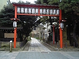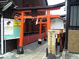 {右}合槌稲荷神社 交差点の少し先右の京都三条廣道郵便局(中之町210-5)の1軒挟んだ角に赤鳥居、「合槌稲荷大明神参道」石柱、説明立札がある。右折して参道を進み突き当たりを左折し民家の間を抜けると境内。平安中期の刀匠・三條小鍛冶宗近が祀った、信仰したとされる神社。祭神は倉稲魂命。謡曲「小鍛冶」では一条天皇の勅命で剣を打つことになった宗近が向い槌を打つ相槌役がおらず稲荷神社に祈願すると化身の童子が現れ2人で名刀・小狐丸を造ったとされている。境内入って右に「小鍛治水」小石碑、手水石。社殿右に昭和39年(1964)灯籠。境内左に境内社の二宮弁財天社、昭和39年灯籠など。他に宗近が造った刀では三日月宗近(東京国立博物館所蔵)が有名で昭和26年(1951)国宝で天下5剣の1つ。 |