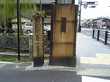 {左}三条白川橋道標 少し先の三条白川橋で白川を渡る手前にある。延宝6年(1678)建立で高さ157cm。京都に現存する最古の道標で昭和62年市登録文化財。正面に「是よりひだり ち於んゐん ぎおん きよ水 みち」右面に「三条通 白川橋」左側に「京都為無案内旅人立之 施主 為二世安楽」とある。橋手前を左折し白川に沿った道を行くと知恩院、祇園、清水寺へと向かう。平成13年に車が追突し折損し補修されており「ぎおん」の「お」あたりに補修跡がある。道標後ろには平成17年設置の鉄柱もある。 |