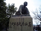 {左}高山彦九郎皇居望俳之像 少し先。高山彦九郎正之は延享4年(1747)上野国新田郡細谷村(現:群馬県太田市細谷町)に生まれ13歳の時に太平記を読み勤皇に目覚めた。18歳で家を出て各地で幕藩体制を批判し勤皇論を説き幕府や各藩に追われて寛政5年(1793)筑後国久留米の友人・森嘉膳宅で46歳で自刃した。京都に出入りする折には京都御所に向かって拝礼しその姿は幕末の歌人・橘曙覧の歌に詠まれたり明治中期の俚謡・サノサ節に謡われるなどした。銅像は昭和3年(1928)に最初に建立されたが昭和19年に金属供出され現在の像は昭和36年の再建。左にある「高山彦九郎先生皇居望拝之趾」石碑(高さ162cm)は供出時に銅像の代わりに建立されたもの。像の後ろには昭和59年建立の直筆歌碑と説明石柱もある。 |