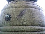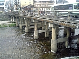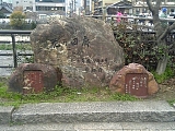 池田屋騒動刀傷跡擬宝珠 橋の擬宝珠は全部で12あり天正18年(1580)や昭和25年(1950)のものが混在している。江戸側から4つ目の左右の擬宝珠には文久3年(1863)新撰組が尊皇攘夷派の浪士を襲撃した池田屋騒動の際に付いたとされる刀傷がある。池田屋は橋を渡り少し先の高瀬川に架かる三条小橋を渡った右にあり現在はチムニーが経営する居酒屋「海鮮茶屋 池田屋 はなの舞」(中京区中島町82)になっており前には昭和2年(1927)「維新史蹟 池田屋騒動之址」碑もある。他に江戸側から2つめの左の擬宝珠には昭和10年に流され昭和25年に造られたことが刻まれている。橋を渡ると東山区から中京区になる。渡った右には高札場があったとされ現在は「天正十七年津国御影」と刻まれた石柱(旧橋脚)が置かれている。 |