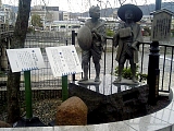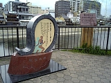 {右}駅伝の碑 橋の手前右に橋の説明立札がありその少し奥にある。大正6年(1917)開催された東海道駅伝徒歩競争の記念碑(高さ145cm)で平成14年建立。上部は「駅伝の歴史ここに始まる」と題し説明と走者のイラスト、下部の土台にはコースである東海道の宿駅が刻まれている。奠都50周年記念大博覧会を盛り上げるため読売新聞社が企画したもので社会部部長で歌人でもある土岐善麿が「駅伝」という言葉を最初に使ったとされる。3日間かけて京都〜東京間を関東組と関西組の2チームが走り関東組が1時間24分差で勝利した。508kmを23区間に分け最長区間は22区(藤沢-川崎)の33km、最短区間は19区(三島-箱根)の13km。ゴール地点の博覧会場玄関前だった東京・上野の不忍池畔にも同じ碑がある。 |