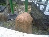 {左}撫で石 弥次喜多像のすぐ左。左に「弥次喜多像」と「撫で石」の説明が1枚になった説明板や「三条大橋擬宝珠刀傷跡」説明板もある。西院春日神社(右京区西院春日町61)の境内社・還来神社(もどろきじんじゃ)にある撫でて旅の安全を祈願する「梛石(なぎいし)」にならい旅の安全を祈願して設置された。京都に産出する鞍馬石で酸化鉄の含有により玉葱状剥離が現れ鉄錆色が表面を覆っているのが特徴。還来神社は淳和天皇の皇后・正子内親王が晩年の貞観16年(874)に住まいの火災で一度は別邸に移ったものの再び戻れたことに感謝し祀ったことから「還来の神」として信仰されるようになった。撫で石は東海道歩きを出発する際は道中の安全を、到着した際は再びここに戻れるよう願って撫でる人が多い。 |
