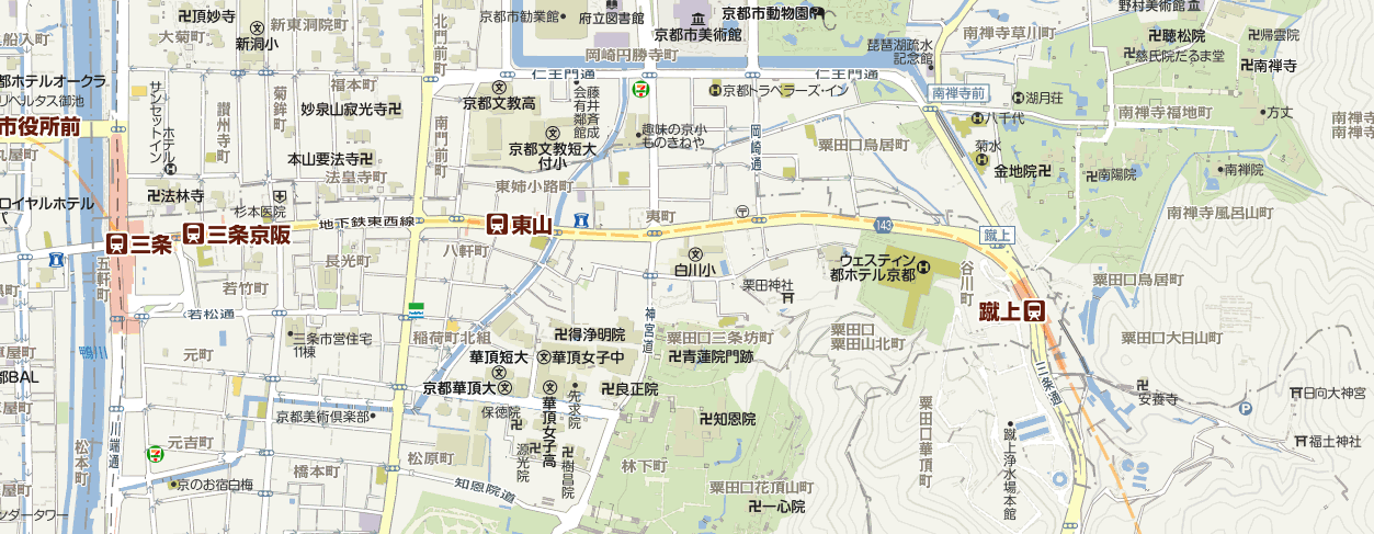 市営地下鉄蹴上駅 東海道を進むと少し先右に1番出口、斜め向かいに2番出口がある。平成9年市営地下鉄東西線醍醐駅〜二条駅間開業とともに開業。それに伴いウェスティン都ホテル京都前にあった京阪電鉄京津線蹴上駅は廃駅となった。この付近は江戸時代は京の出入口として茶屋が並び旅人と送迎客で賑わっていた。大名や武士にとっては京に入る前の身支度を整える場所でもあった。大田南畝も享和元年(1801)刊「改元紀行」に蹴上の茶店で休憩し身支度を整えたと記述している。元治元年(1864)刊「再撰花洛名勝図会」には街道に面した日向大神宮一之鳥居横に弓屋、向かいに藤屋、井筒屋などの茶屋とともに東海道を通る牛車や大勢の旅人の様子が描かれている。駅付近から東海道は左右とも東山区となる。 |